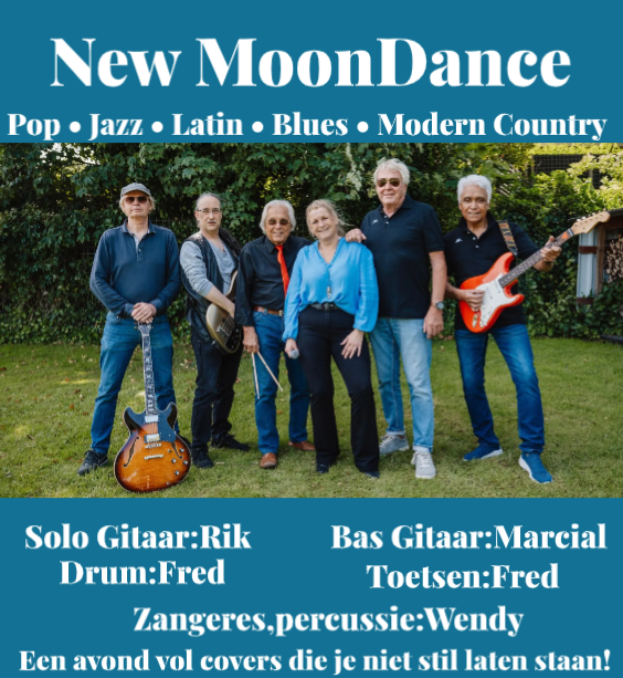 New Moondance is een band met lef, wij spelen nummers waar niet iedere band zich aan waagt. Covers uit de jaren 60 tot nu, pop met zo af en toe een latin of jazzy sausje, van Santana tot Van Morrison, van Magriet Eshuijs tot Fleetwood Mac, Sade en Diana Krall. Dat kan alleen maar met ervaren muzikanten, en dat zijn wij, gepokt en gemazeld in bands als Sandy Coast, Knappe Mannen Band, Diva’s, Sissy & the Saints, Candlelight, Fresh Cream en Crossroads. Kwaliteit gegarandeerd voor een gevarieerd muzikaal uurtje, sessie of hele avond.